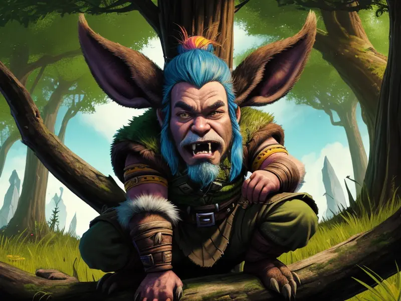 Illustration of Rabid Dwarf, Hunter, Perched atop a tree, scanning the horizon, extreme close-up, warcraft style, colorful and fun