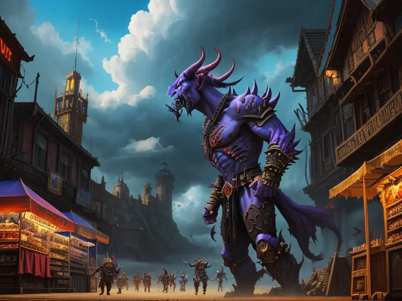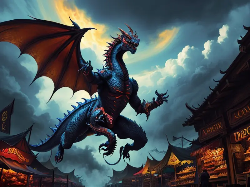 Illustration of Relentless Demon, Dragon Knight, In a marketplace floating among clouds, medium shot, warcraft style, colorful and fun