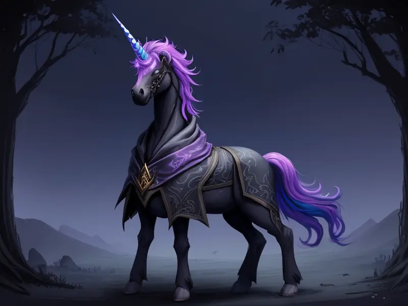 Illustration of Ashen Unicorn, Wears a cloak woven from midnight silk, Very Rare, warcraft style, colorful and fun
