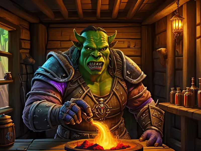 Illustration of Noble Orc, Warden, In a wooden hut, brewing a magical potion, medium shot, warcraft style, colorful and fun