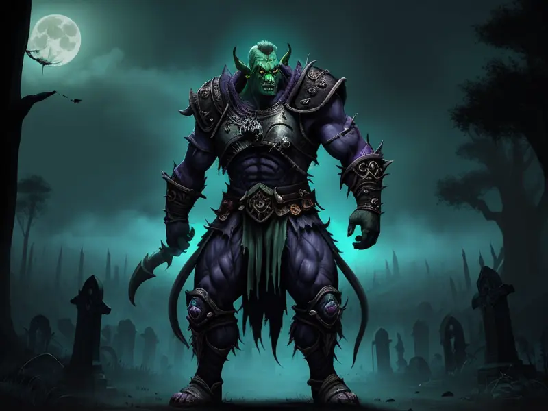 Illustration of Ghost-touched Orc, Bone Warden, In a moonlit graveyard, mist curling around their feet, full-body shot, warcraft style, colorful and fun