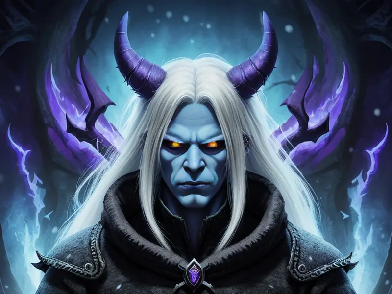 Illustration of Feral Demon, Necromancer, White hair like snow, three-quarter view, warcraft style, colorful and fun