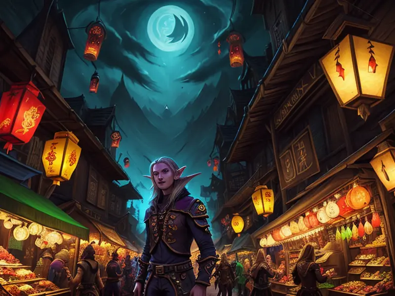 Illustration of Unholy Elf, Bard, In a nocturnal market illuminated by magical lanterns, Epic, warcraft style, colorful and fun