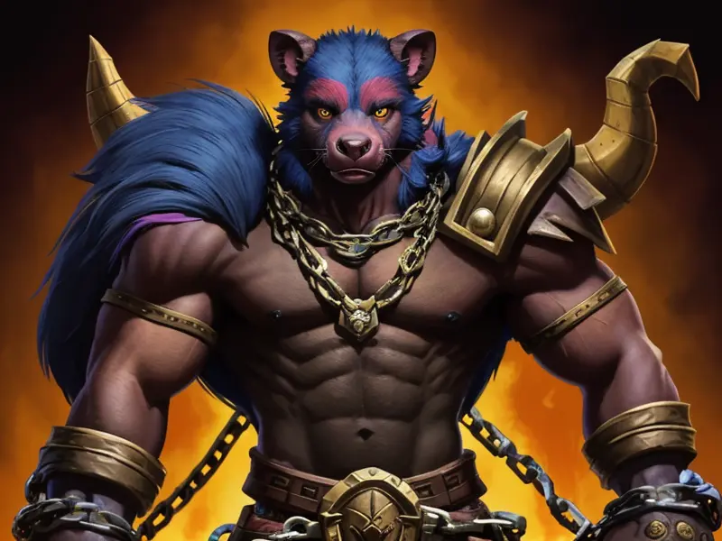 Illustration of Skyforged Tasmanian Devil, Left arm wrapped in chains, shoulder-level shot, warcraft style, colorful and fun