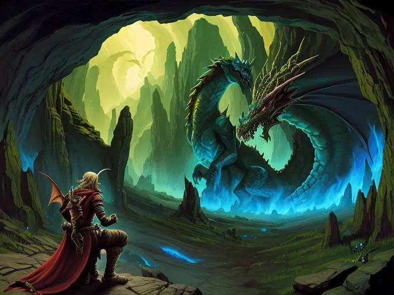 Illustration of Hallowed Elf, Tidecaller, At the entrance of a dragon’s lair, Epic, warcraft style, colorful and fun