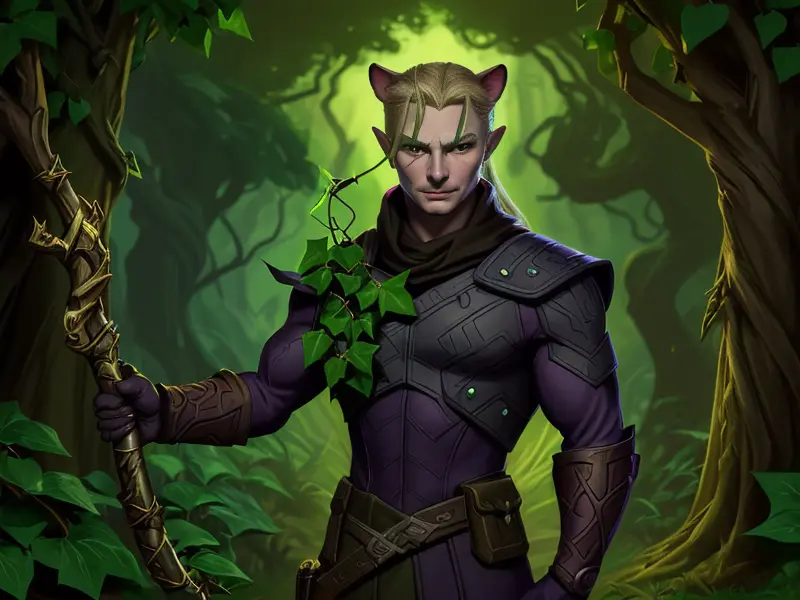 Illustration of Shadowbound Ocelot, A staff wrapped in ivy that blooms with light, shoulder-level shot, warcraft style, colorful and fun