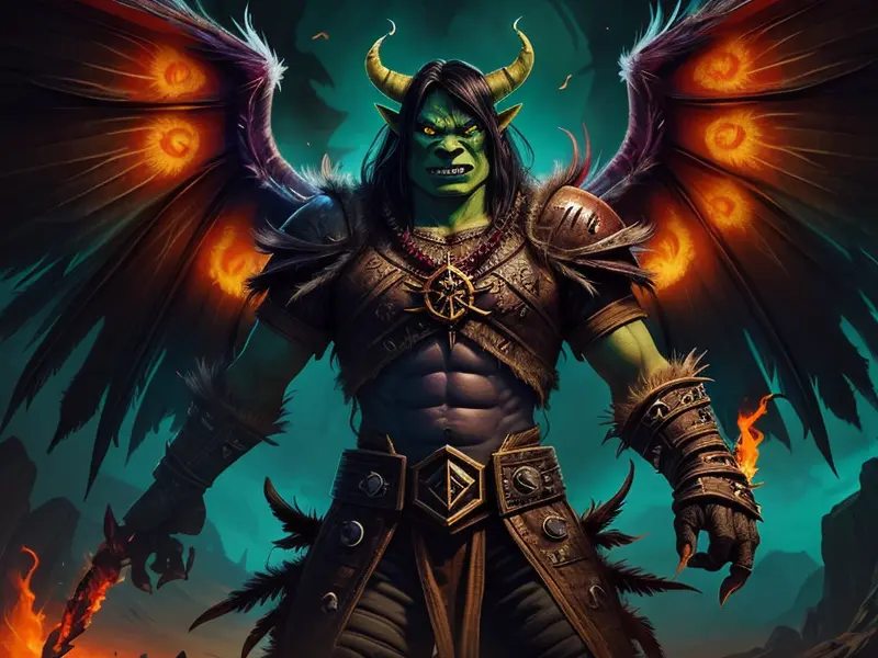 Illustration of Ember-eyed Orc, Occultist, Wings made of burning feathers, high angle shot, Epic, warcraft style, colorful and fun