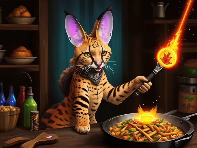 Illustration of Thunder-marked Serval, Glowing frying pan with arcane energy, warcraft style, colorful and fun