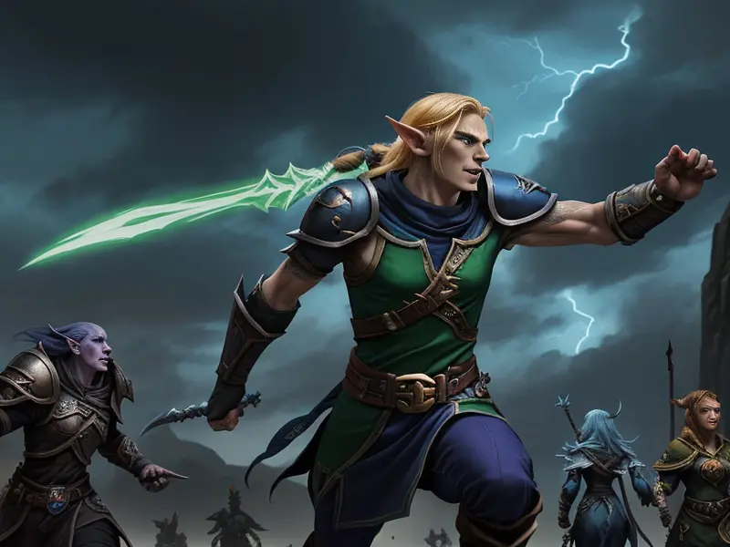 Illustration of Rune-marked Elf, Duelist, Wears boots that let them fly for short distances, warcraft style, colorful and fun